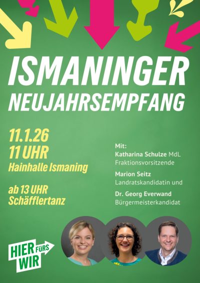 Am Sonntag, 11. Januar 2026 ab 11:00 Uhr, begrüßen wir Katharina Schulze, Fraktionsvorsitzende der Grünen im Bayerischen Landtag, Marion Seitz Landratskandidatin und Georg Everwand Bürgermeisterkandidat für Ismaning in der Hainhalle.