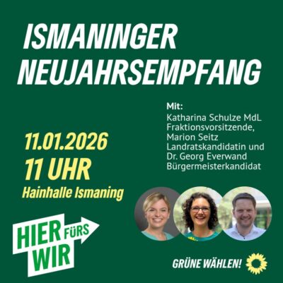 Der Ortsverband der Grünen Ismaning lädt gemeinsam mit dem Kreisverband München-Land herzlich zum Neujahrsempfang 2026 ein!